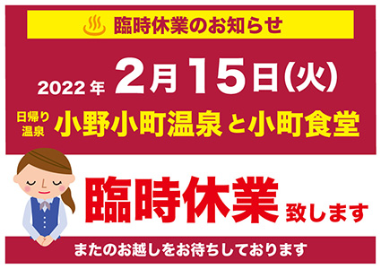 2022年2月15日(火)は、小野小町温泉・小町食堂を臨時休業とさせていただきます。