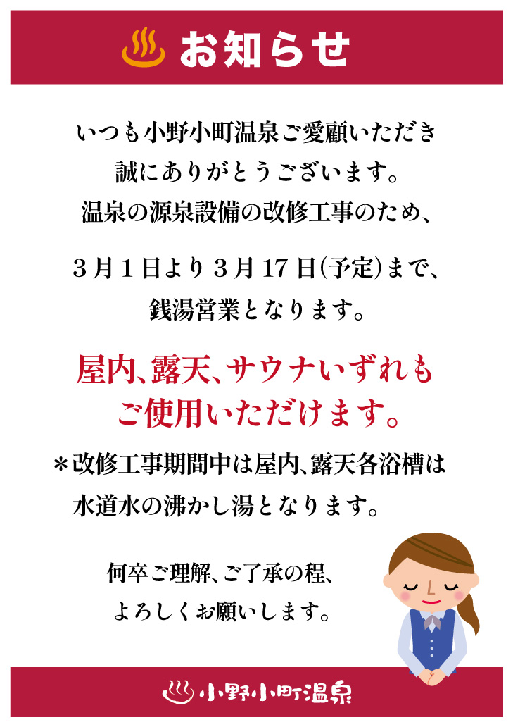 温泉の泉源設備の改修工事のため、3月1日より3月17日(予定)まで、銭湯営業となります。 屋内、露天、サウナいずれもご使用いただけます。