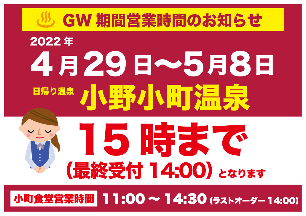 2022年4月29日(金)~2022年5月8日(日)のゴールデンウィーク期間中、日帰り温泉のご利用時間は15時までとさせていただきます。(最終受付14時)