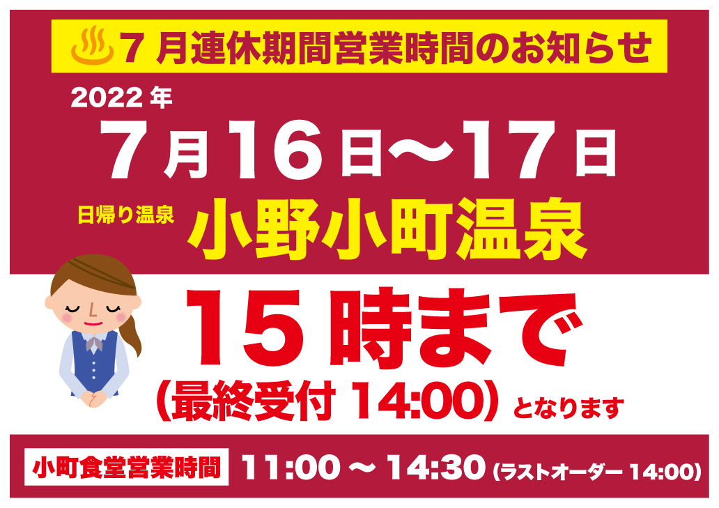 2022年7月16日(土)~2022年7月17日(日)、日帰り温泉のご利用時間は15時までとさせていただきます。(最終受付14時)
