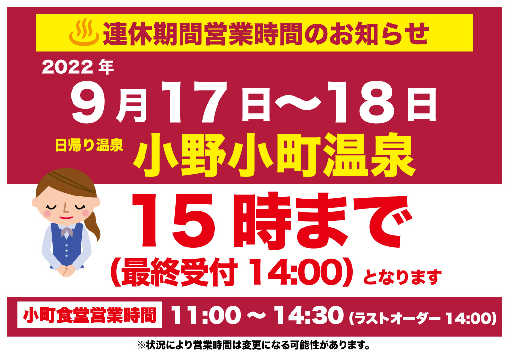 2022年9月17日(土)~2022年9月18日(日)、日帰り温泉のご利用時間は15時までとさせていただきます。(最終受付14時)