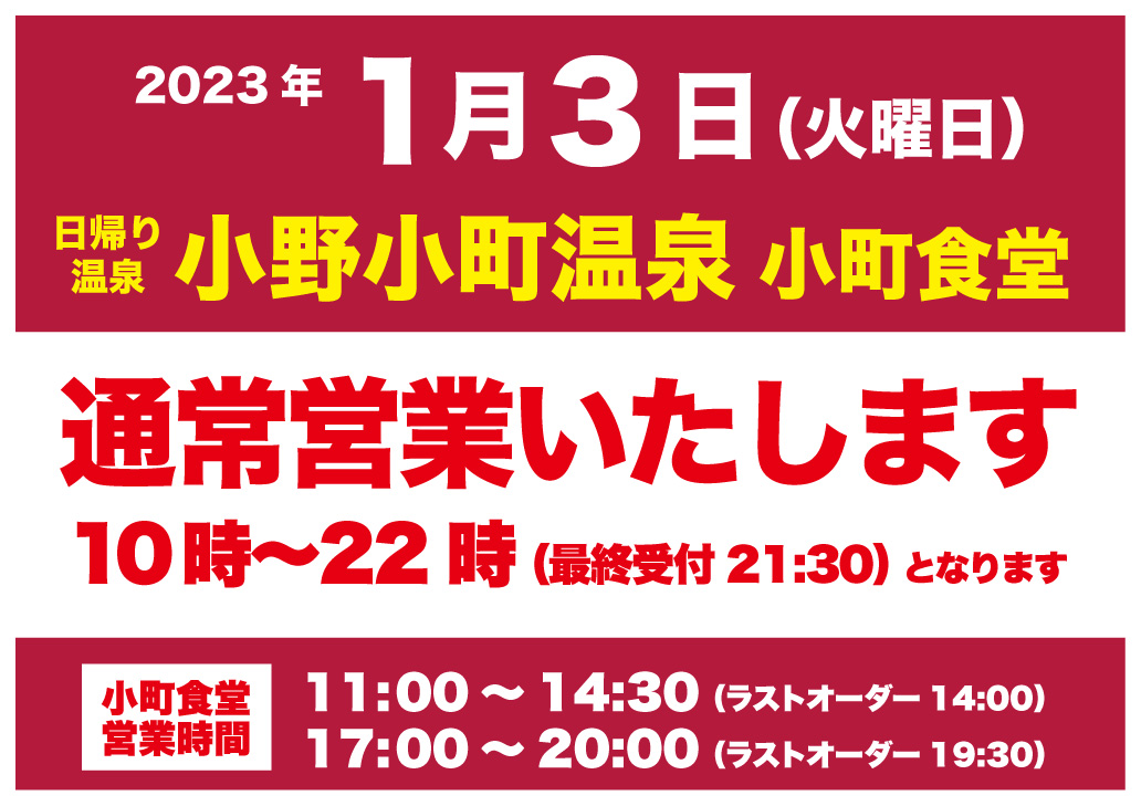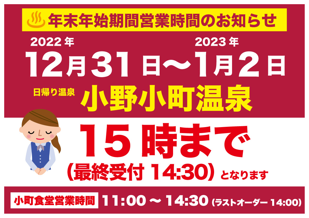 2022年12月31日(土)~2023年1月2日(月)、日帰り温泉のご利用時間は15時までとさせていただきます。(最終受付14時30分)