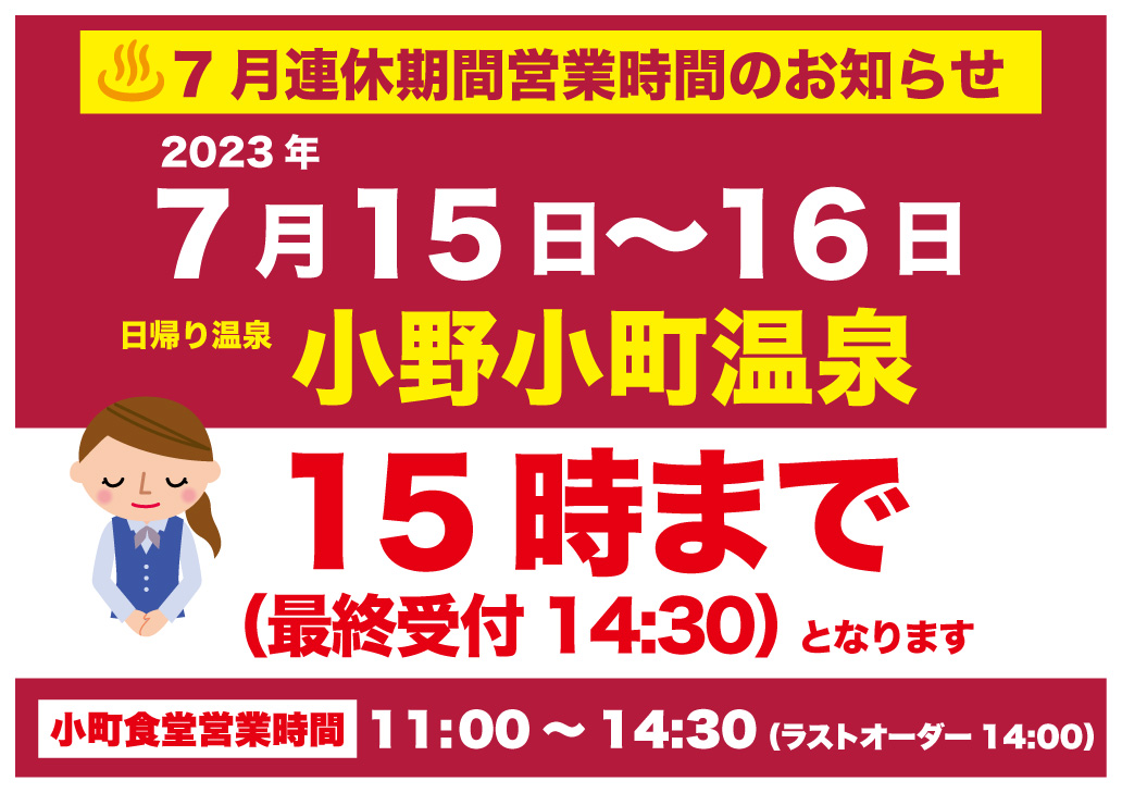 2023年7月15日(土)~2023年7月16日(日)、日帰り温泉のご利用時間は15時までとさせていただきます。(最終受付14時)