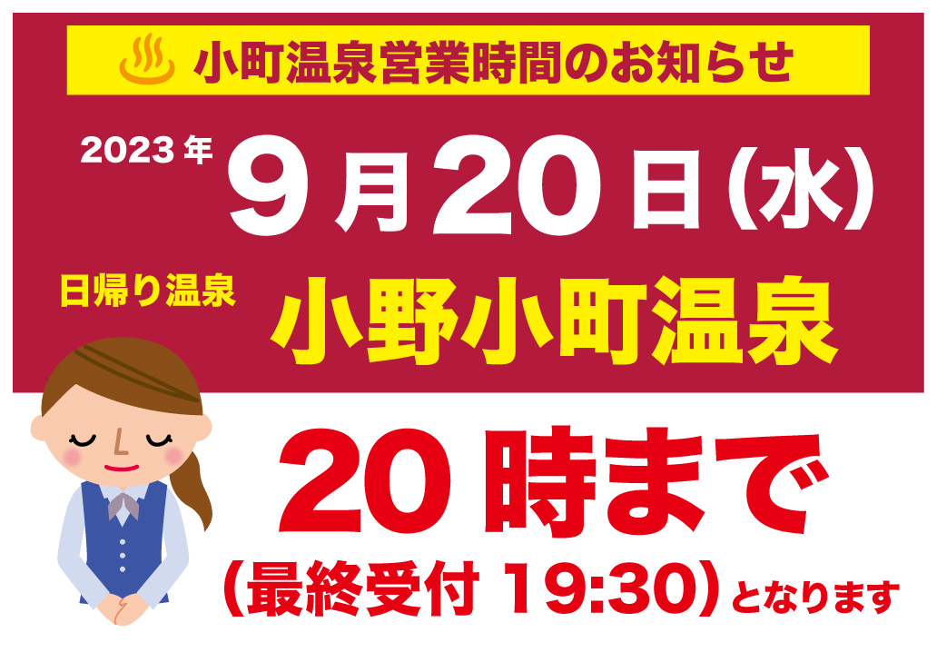 2023年9月23日(水)は、日帰り温泉のご利用時間は20時までとさせていただきます。(最終受付19時30分)