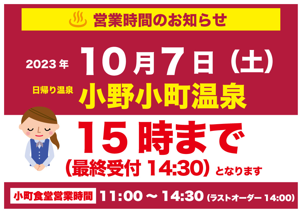 2023年10月7日(土)は、日帰り温泉のご利用時間を15時までとさせていただきます。(最終受付14時30分)