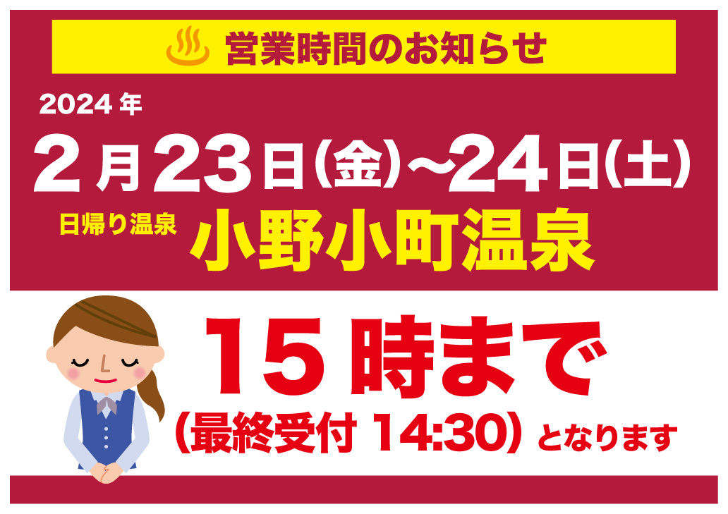 2024年2月23日(金・祝)・24(土)は、日帰り入浴の営業時間を15時(最終受付14時30分)までとさせていただきます。