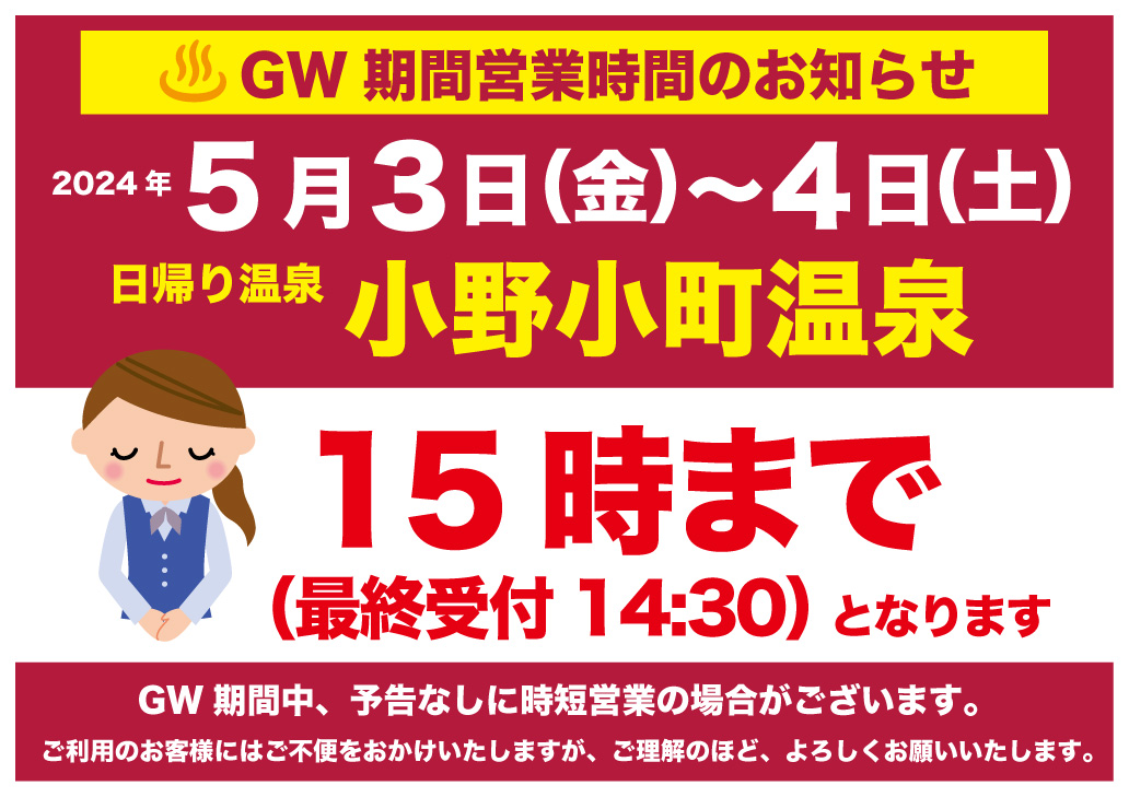 2024年ゴールデンウィーク、5月3日(金・祝)・4(土)は、日帰り入浴の営業時間を15時(最終受付14時30分)までとさせていただきます。