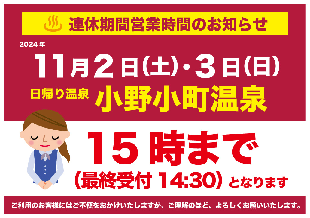 2024年11月2日(土)・3日(日・祝)は、日帰り入浴の営業時間を15時(最終受付14時30分)までとさせていただきます。