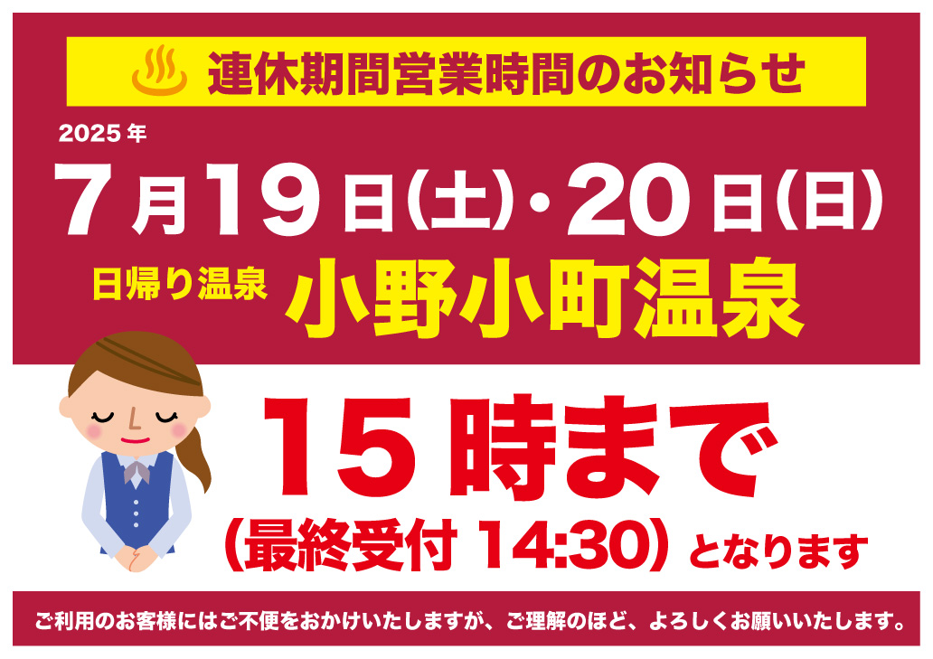 2025年7月19日(土)20日(日)は日帰り入浴の営業時間を15時(最終受付14時30分)までとさせていただきます。