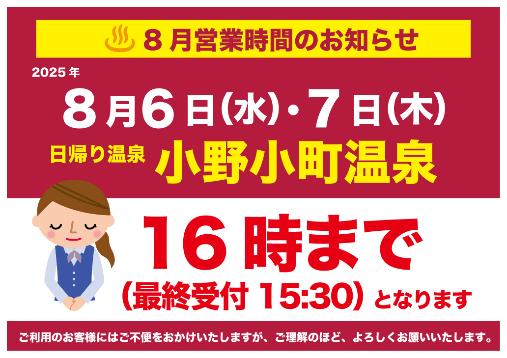 8月6日(水)・7日(木) 日帰り入浴の営業時間は16時(最終受付15時30分)まで