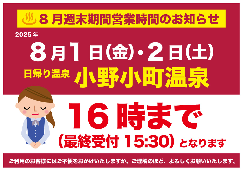 8月1日(土)・2日(日) 日帰り入浴の営業時間は16時(最終受付15時30分)まで