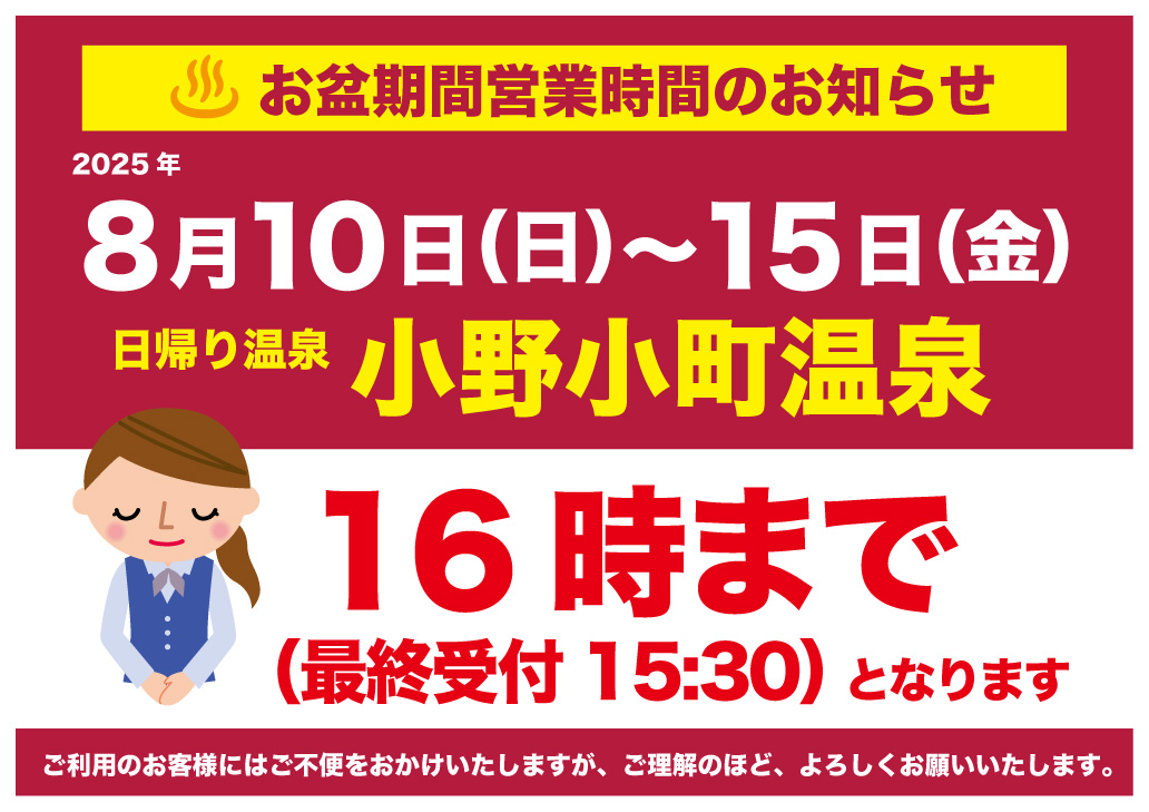 8月10日(日)~15日(金) 日帰り入浴の営業時間は16時(最終受付15時30分)まで