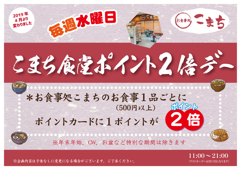 2019年4月より、こまち食堂は毎週水曜日ポイント2倍!