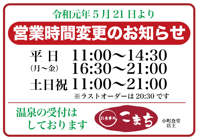 令和元年5月21日(火)より、お食事処こまちの営業時間を下記の通り変更いたします。