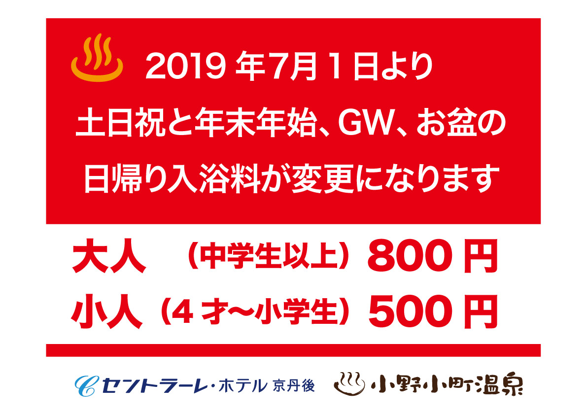 2019年7月より、土日祝・年末年始・ゴールデンウィーク・お盆期間中、日帰り入浴料が下記の通り変更となります。