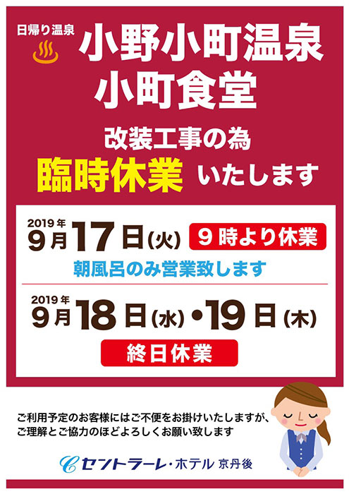 2019年9月17日(火)9時(※朝風呂のみ営業いたします)~2019年9月19日(木)まで、「小野小町温泉」「小町食堂」は、改装工事のため、臨時休業いたします。