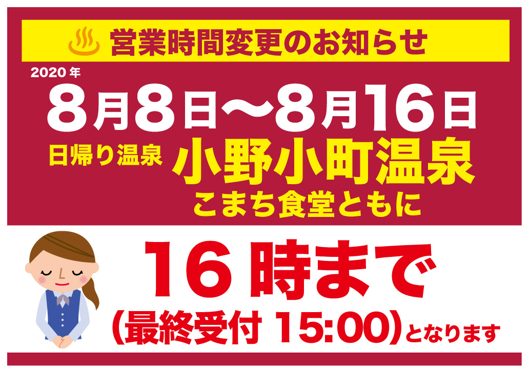 2020年8月8日(土)~16日(日)の日帰り温泉のご利用は10時から16時までとなります。(最終受付15時まで)