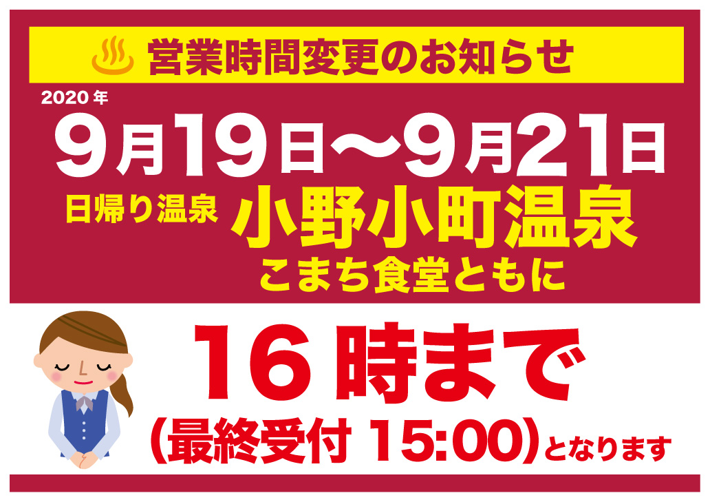 9月19日~21日 日帰り温泉営業時間短縮のお知らせ